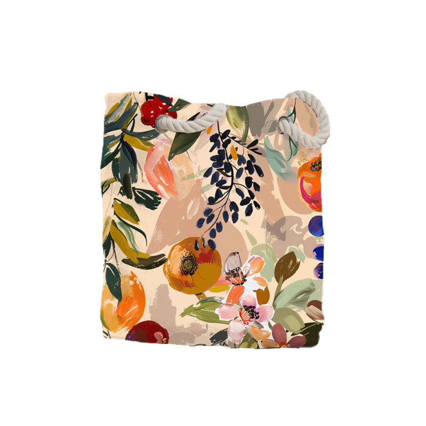 This tote isn't just a bag; it's a statement piece, adorned with our original art and prints, meticulously crafted and sewn together just for you. With its crisp white interior, this tote showcases inspiring designs and adds a touch of elegance to your everyday carry.Crafted from high-quality terry cloth toweling, our tote bag offers a unique texture that's both soft to the touch and durable enough for daily use. Its generous dimensions of 18"W x 15"H x 5.5"D make it the perfect size for beach days, shopping trips, or carrying your essentials with ease. Featuring sturdy rope handles, adding a nautical charm and ease of wear.